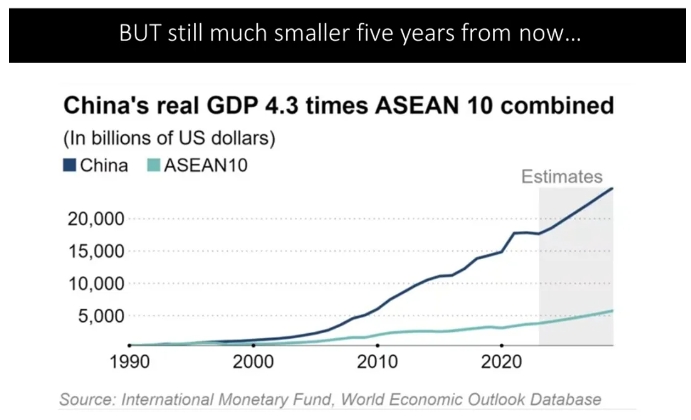 比较:中国的GDP是东盟十国总和的4.3倍。尽管东盟十国的GDP也在增长,但与中国相比,其总量仍然较小。