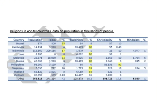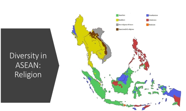 伊斯兰教在印尼和马来西亚的比例最高,尤其是在印尼占87%。佛教在柬埔寨、老挝、缅甸和泰国是主流宗教,尤其是柬埔寨和缅甸,佛教信仰者比例达到80%。基督教在菲律宾占据主导地位,占92%。印度教在马来西亚和新加坡有一定影响力。