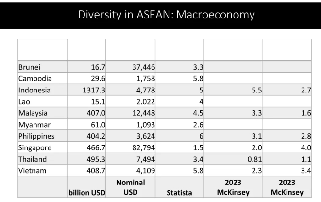 东盟(ASEAN)国家的宏观经济数据,包括GDP(以十亿美元为单位)、人均GDP(以美元为单位)和其他经济指标(由Statista和McKinsey提供的2023年数据)。