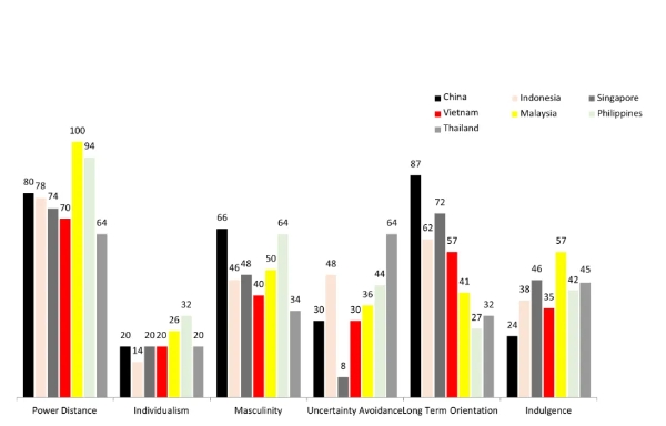 权力距离(Power Distance):这个维度衡量的是一个社会中权力不平等的接受程度。得分越高,表示社会中权力不平等被更广泛地接受。马来西亚得分最高(100),其次是中国(80),而越南得分最低(70)。