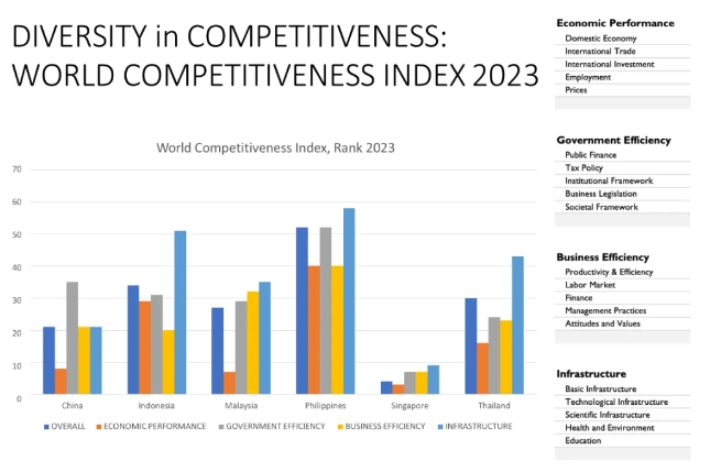 政府效率(GOVERNMENT EFFICIENCY):这个领域包括公共财政、税收政策、制度框架、商业立法和社会框架。新加坡在政府效率方面得分最高,其次是菲律宾和马来西亚。