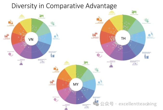 越南(VN)、泰国(TH)、马来西亚(MY)各行业比较优势,图表中的颜色和图标代表了具体的产业或经济活动,例如农业、制造业、服务业、科技产业等。