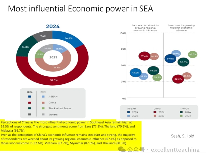 中国:在东南亚,被视为最具影响力的经济大国,有59.5%的受访者持此观点。美国:位居第二,有14.3%的受访者认为美国是最具影响力的经济大国。东盟(ASEAN):有10.5%的受访者认为东盟是最具影响力的经济大国。其他:有9.4%的受访者选择了其他选项。
