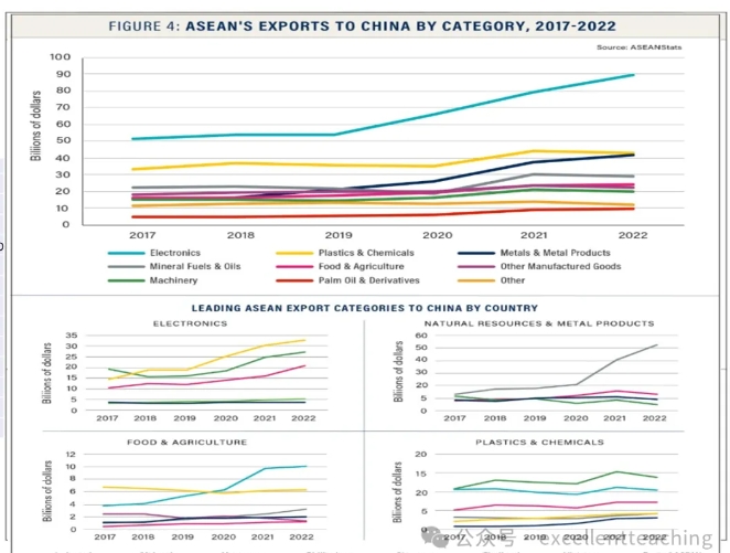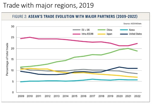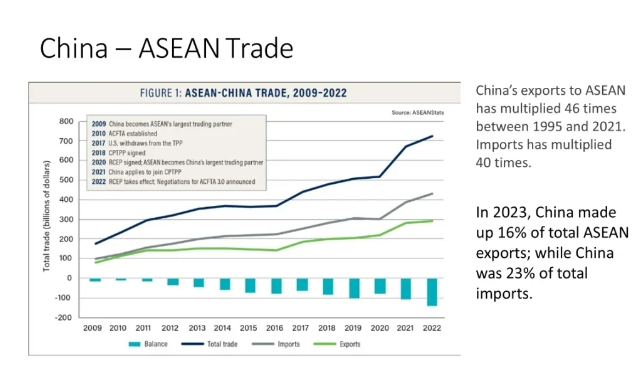 2023年贸易占比:在2023年,中国占东盟总出口的16%,占总进口的23%。