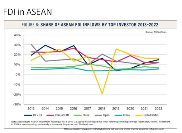 东盟FDI流入的宏观视角,展示了不同国家和地区在东盟经济中的作用和影响力。