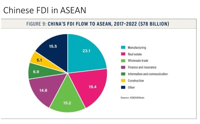 制造业:占中国对东盟FDI的最大份额,为23.1%。房地产:占15.5%。批发贸易:占5.1%。金融和保险:占6.9%。信息和通信:占15.2%。建筑:19.4%。其他:占14.8%。