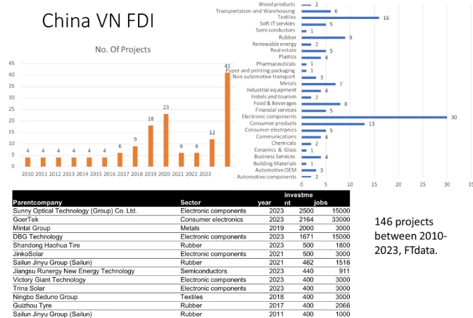 这些数据展示了中国在越南的投资活动在过去十多年中的增长趋势,以及投资的重点行业和地区。