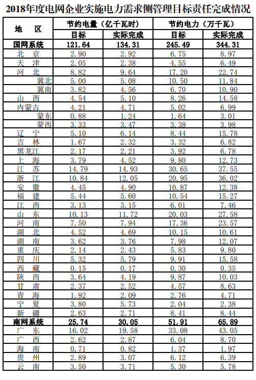2018年,国家电网公司、南方电网公司坚持以习近平新时代中国特色社会主义思想为指导,全面贯彻党的十九大和十九届二中、三中全会精神,认真落实中央经济工作会议和政府工作报告各项部署,扎实开展制度建设、宣传培训、平台支撑、机制创新等工作,深化技术研发,创新服务模式,构建清洁低碳、安全高效的能源体系,有效促进节能减排和经济高质量发展。经核查,2018年国家电网公司、南方电网公司均完成电力需求侧管理目标任务,共节约电量164.4亿千瓦时,节约电力410.2万千瓦。各省(区、市)电网企业2018年度目标任务完成情况见附件。其中,山西、黑龙江、江苏、山东、广东等省工作措施得力,社会节电比重较高,予以通报表扬。