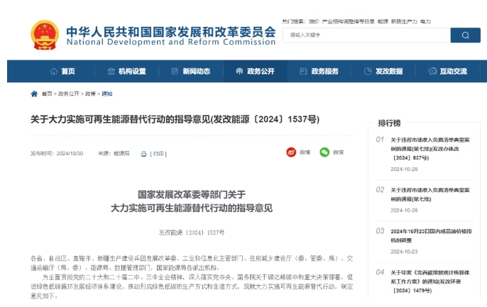 10月30日,国家发展改革委、工业和信息化部、国家能源局等六部门发布《关于大力实施可再生能源替代行动的指导意见》。