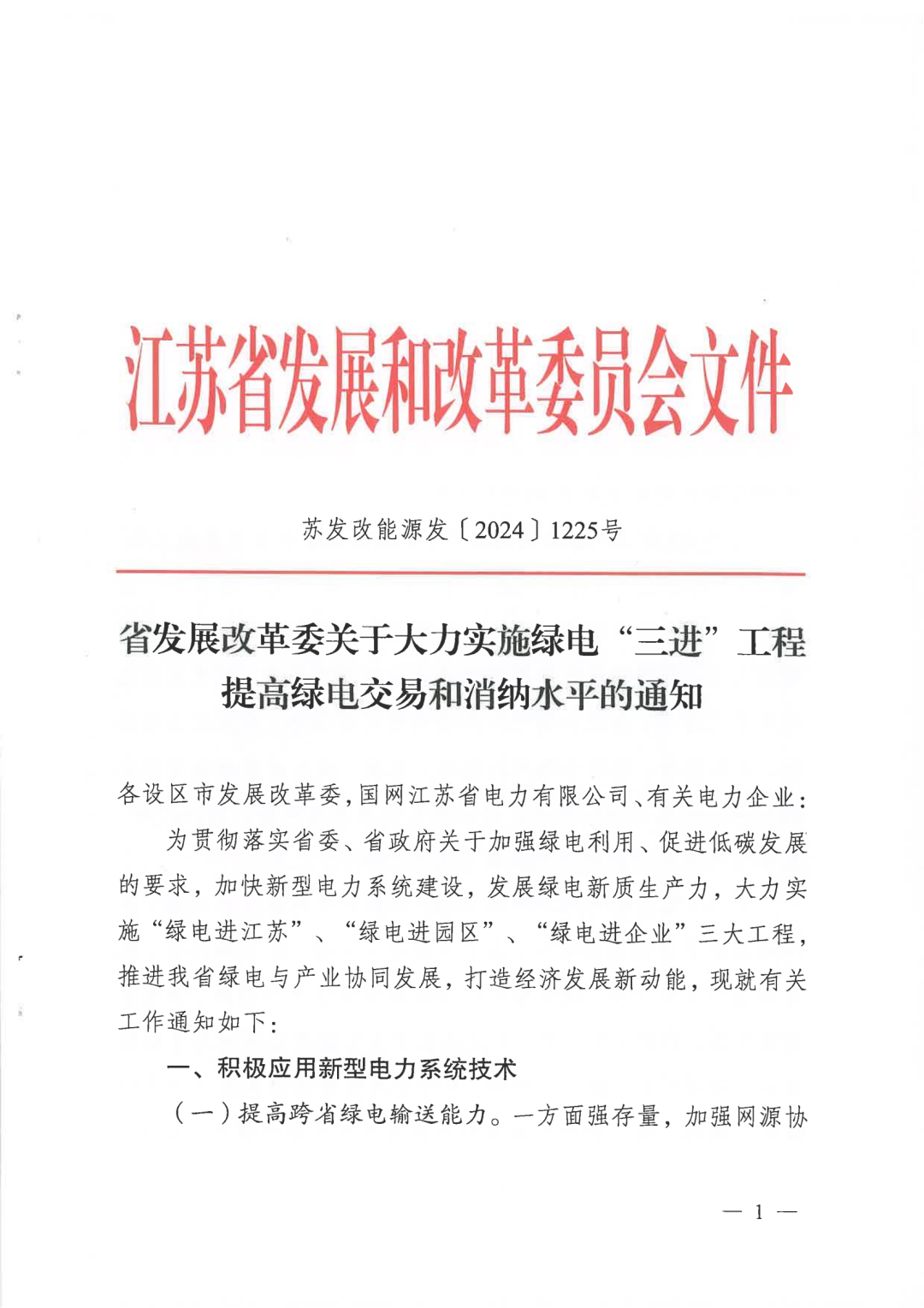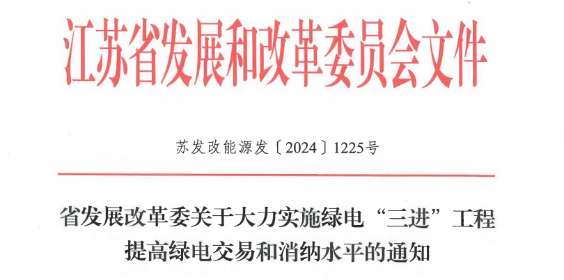 11月5日,江苏省发改委发布《关于大力实施绿电“三进”工程提高绿电交易和消纳水平的通知》,文件提出:大力实施“绿电进江苏”、“绿电进园区”、“绿电进企业”三大工程。