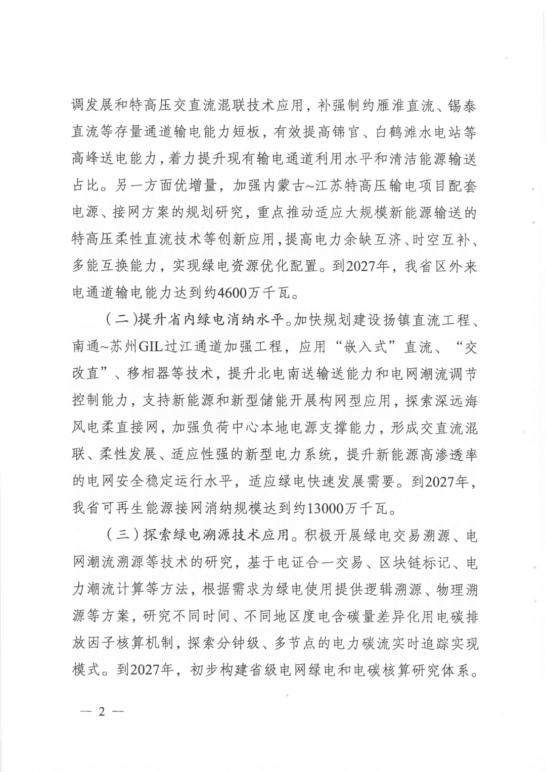 (一)提高跨省绿电输送能力。一方面强存量,加强网源协调发展和特高压交直流混联技术应用,补强制约雁淮直流、锡泰直流等存量通道输电能力短板,有效提高锦官、白鹤滩水电站等高峰送电能力,着力提升现有输电通道利用水平和清洁能源输送占比。另一方面优增量,加强内蒙古~江苏特高压输电项目配套电源、接网方案的规划研究,重点推动适应大规模新能源输送的特高压柔性直流技术等创新应用,提高电力余缺互济、时空互补、多能互换能力,实现绿电资源优化配置。到2027年,我省区外来电通道输电能力达到约4600万千瓦。