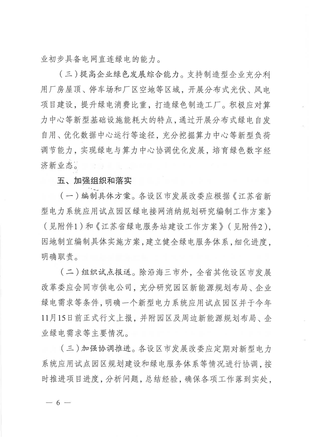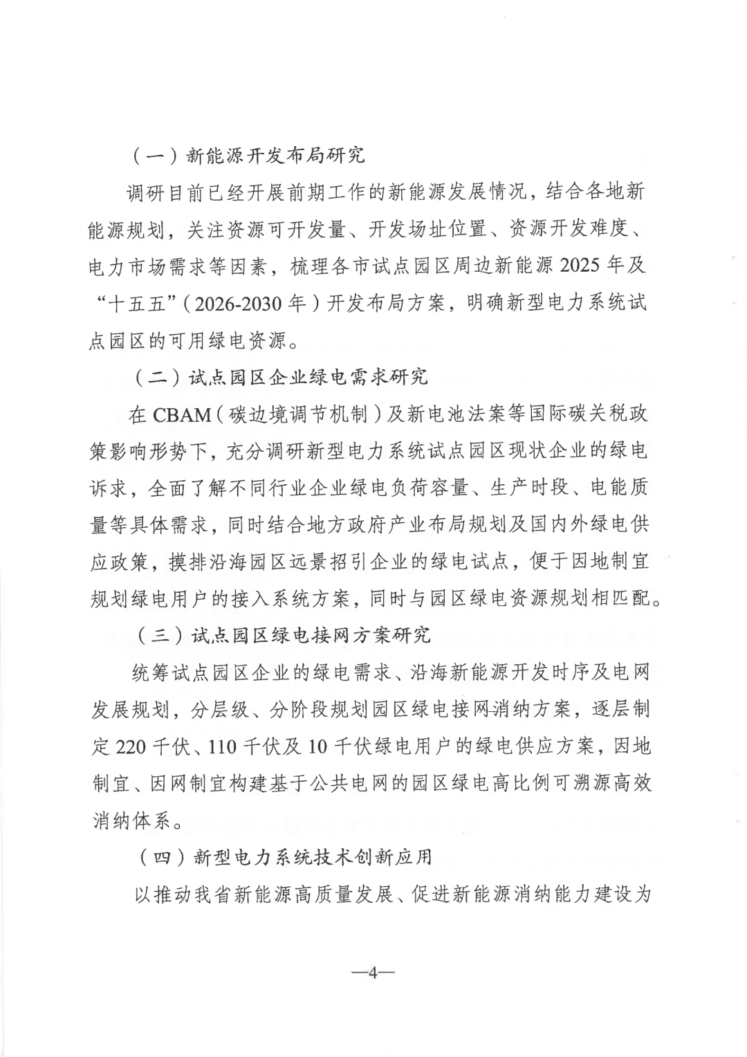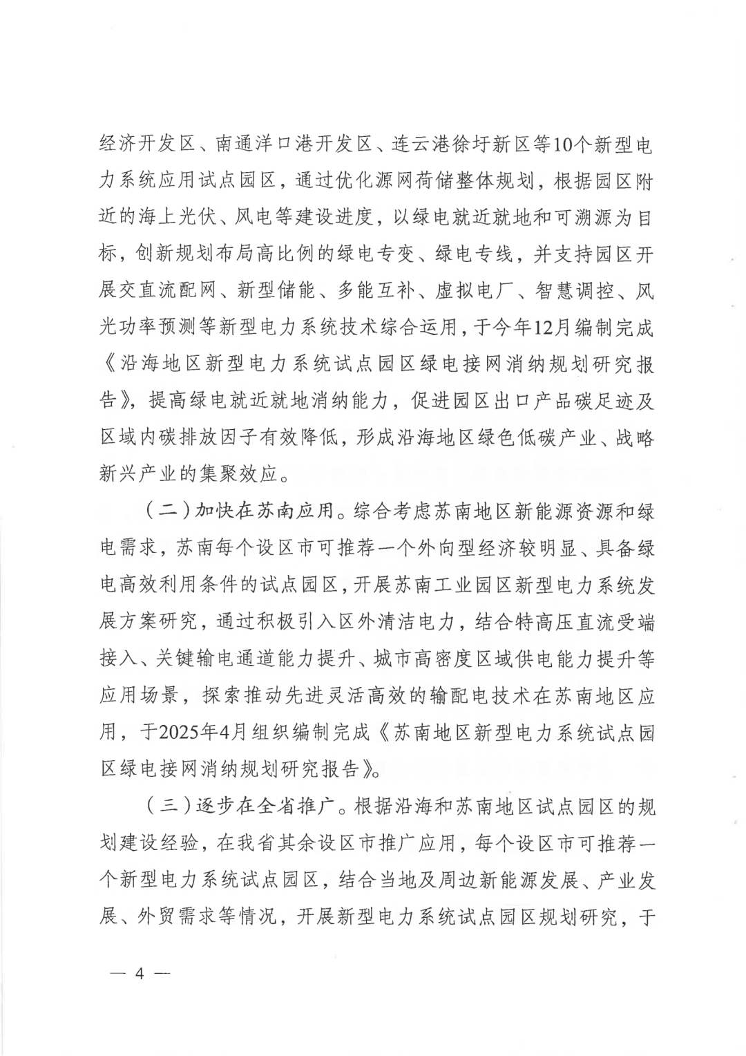 (二)加快在苏南应用。综合考虑苏南地区新能源资源和绿电需求,苏南每个设区市可推荐一个外向型经济较明显、具备绿电高效利用条件的试点园区,开展苏南工业园区新型电力系统发展方案研究,通过积极引入区外清洁电力,结合特高压直流受端接入、关键输电通道能力提升、城市高密度区域供电能力提升等应用场景,探索推动先进灵活高效的输配电技术在苏南地区应用,于2025年4月组织编制完成《苏南地区新型电力系统试点园区绿电接网消纳规划研究报告》。