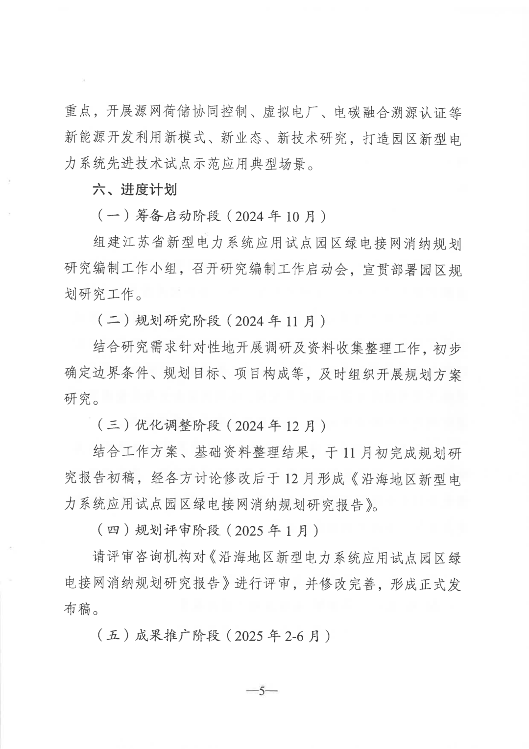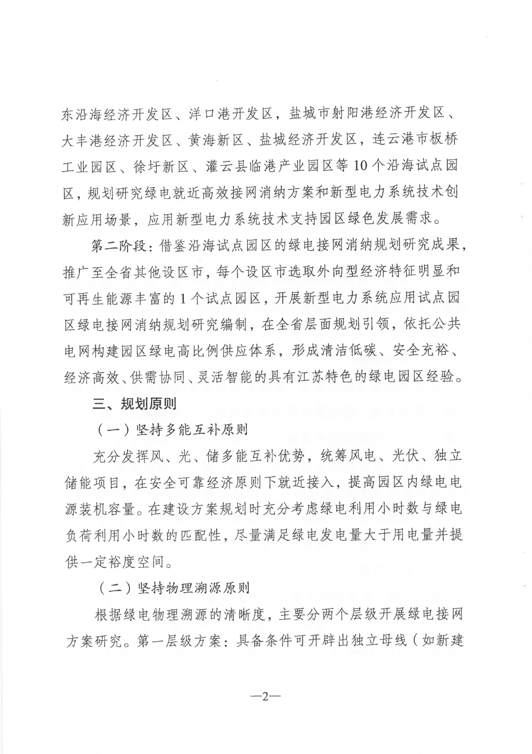 (一)率先在沿海布局。对《江苏沿海地区新型电力系统实施方案》(苏发改能源发〔2023〕1064号)中明确的盐城大丰港经济开发区、南通洋口港开发区、连云港徐圩新区等10个新型电力系统应用试点园区,通过优化源网荷储整体规划,根据园区附近的海上光伏、风电等建设进度,以绿电就近就地和可溯源为目标,创新规划布局高比例的绿电专变、绿电专线,并支持园区开展交直流配网、新型储能、多能互补、虚拟电厂、智慧调控、风光功率预测等新型电力系统技术综合运用,于今年12月编制完成《沿海地区新型电力系统试点园区绿电接网消纳规划研究报告》,提高绿电就近就地消纳能力,促进园区出口产品碳足迹及区域内碳排放因子有效降低,形成沿海地区绿色低碳产业、战略新兴产业的集聚效应。