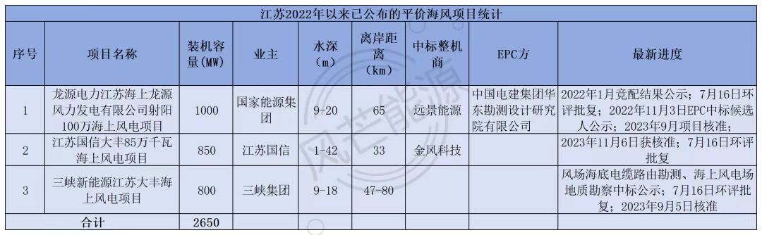 根据公开信息,江苏最新的海风规划还没有获批。只从目前完成竞配的三个平价海上风电项目来看,江苏省海上风电项目水深最深达到了42m,最远离岸距离达到了80km。其他海上风电项目水深多集中在9-20m,离岸距离多集中在33-65km。