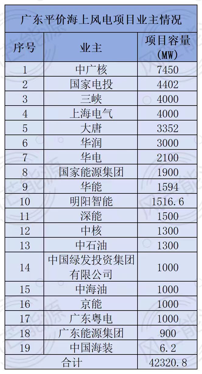 在这些已公开的项目中,从开发商角度来看,中广核斩获的广东海上风电项目容量最大,为7.45GW;国家电投位居第二,超4.4GW;三峡和上海电气均为4GW;大唐超3.3GW。