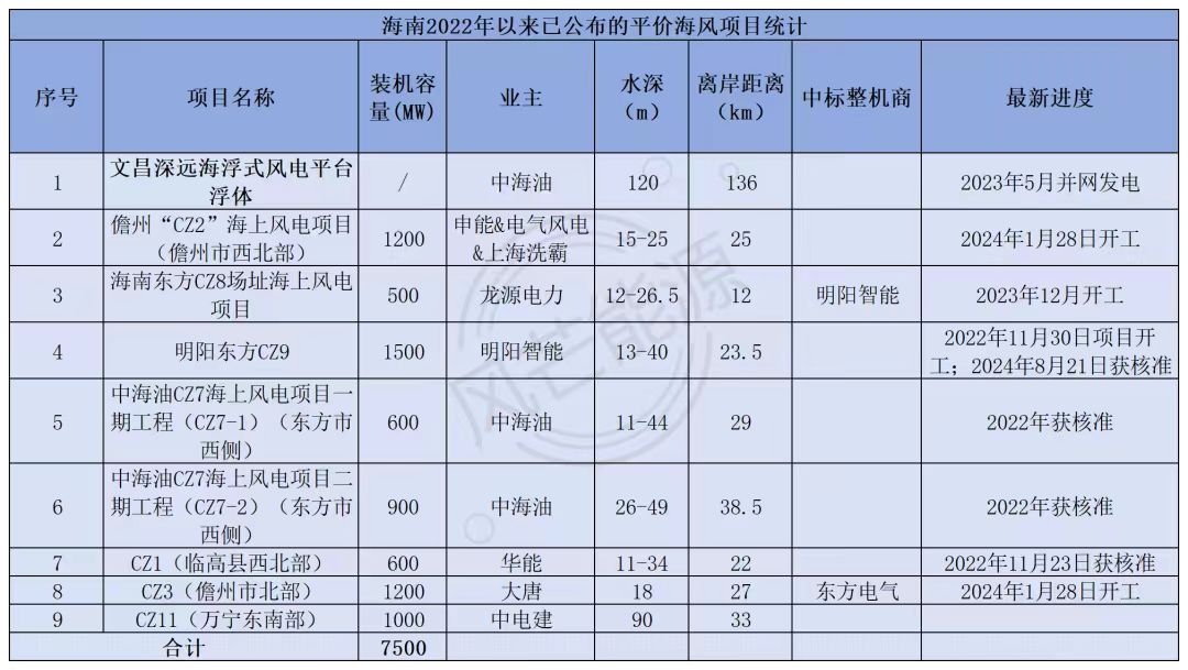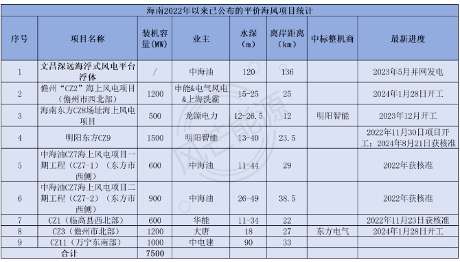 如不计入这些较为前期的项目规划,只从具体落地的项目来看,据风芒能源梳理,海南目前已披露7.5GW海上风电项目。