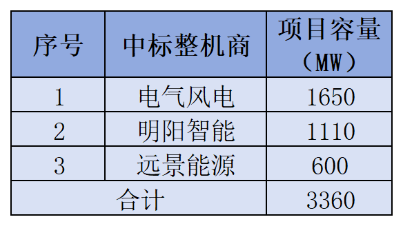对比已经完成整机招中标的项目,可以看到项目基本由电气风电、明阳智能、远景能源三家分获。