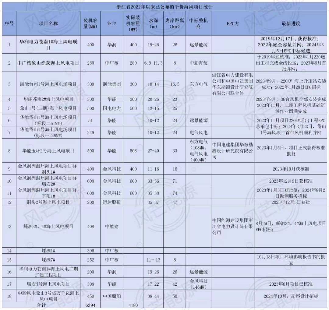 据风芒能源梳理,截至目前,浙江省已披露平价海上风电项目容量约6.4GW。