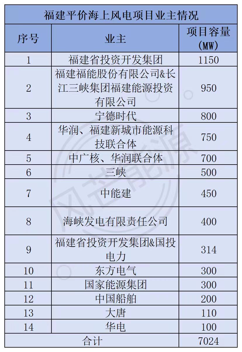 在这些项目中,从业主来看,福建省投资开发集团项目容量最多,为1.15GW;容量第二的为福建福能股份有限公司&长江三峡集团福建能源投资有限公司联合体,为950MW;宁德时代容量为800MW。