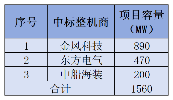 长乐外海I区(北)海上风电场项目业主为东方电气,因此中标整机商默认为东方电气,容量为300MW;漳州六鳌I-1区海上风电场项目业主为中国船舶,因此中标整机商默认为中船海装,容量为200MW。