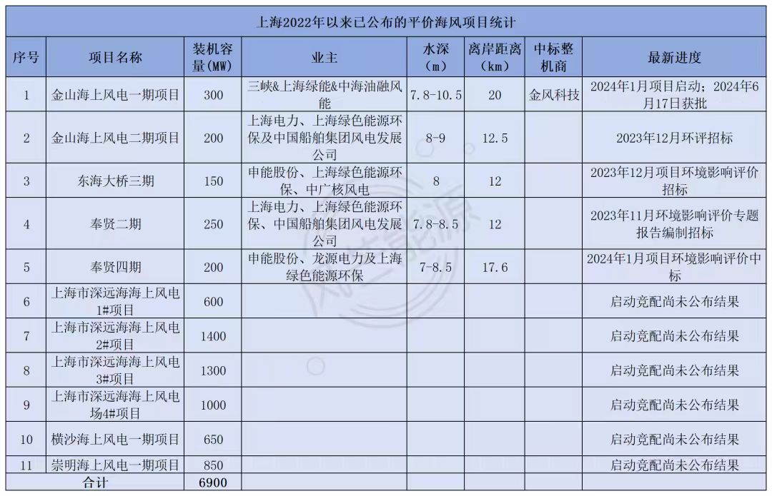 从目前公开信息披露的项目水深和离岸距离来看,上海市海上风电项目水深集中在7-10m,离岸距离集中在12-20km。