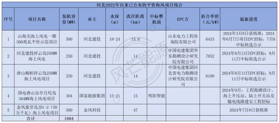 风芒能源根据公开信息不完全梳理,截至目前,河北已披露1.8GW平价海上风电项目,业主涉及河北建投、金风科技和国家能源集团。