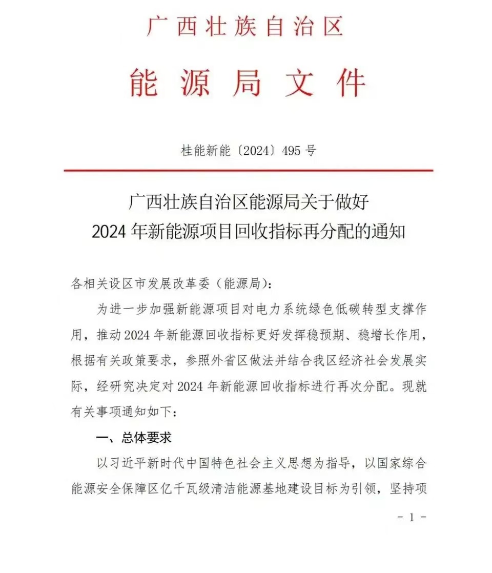11月14日,广西壮族自治区能源局发布关于做好2024年新能源项目回收指标再分配的通知(以下简称《通知》)。