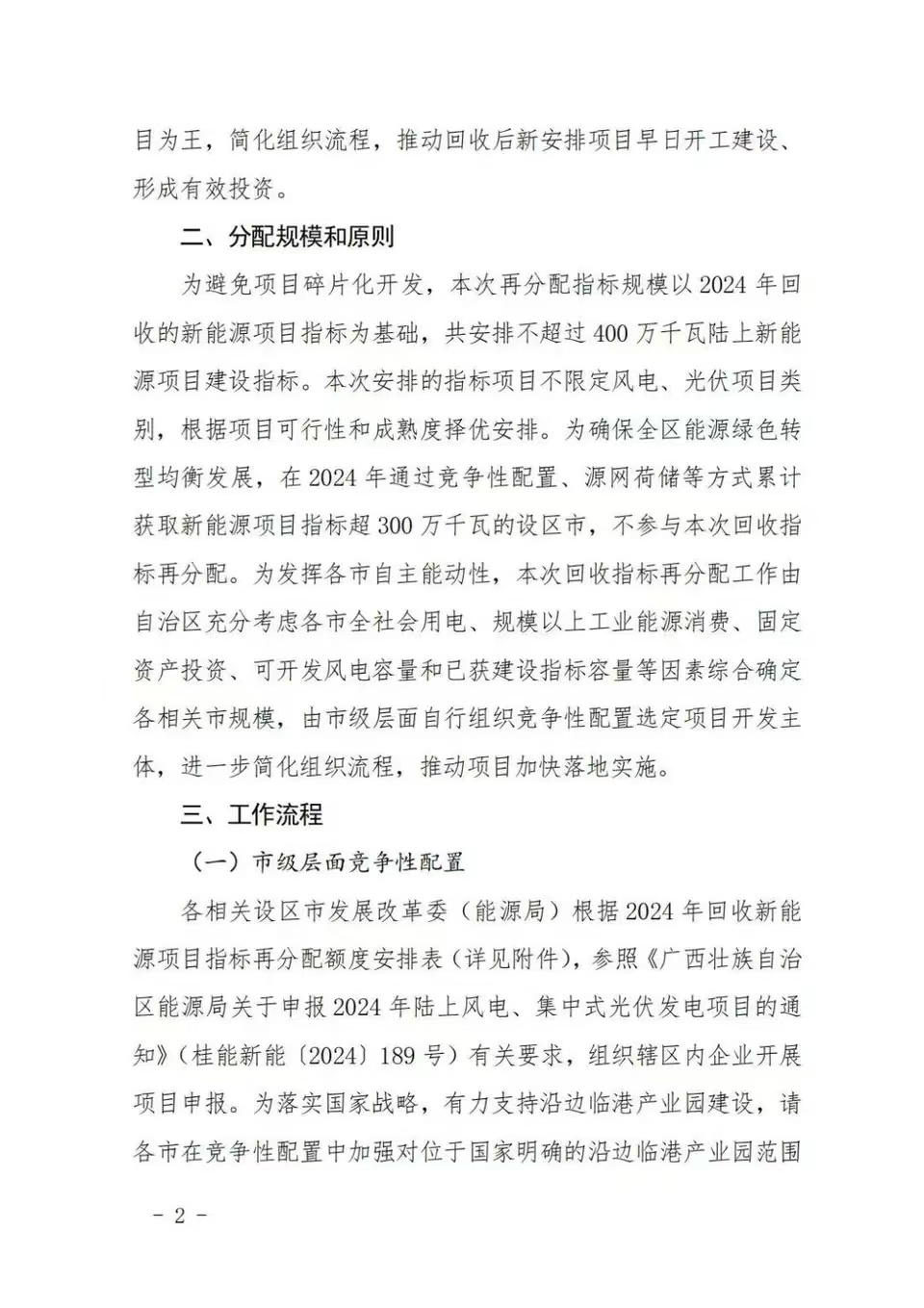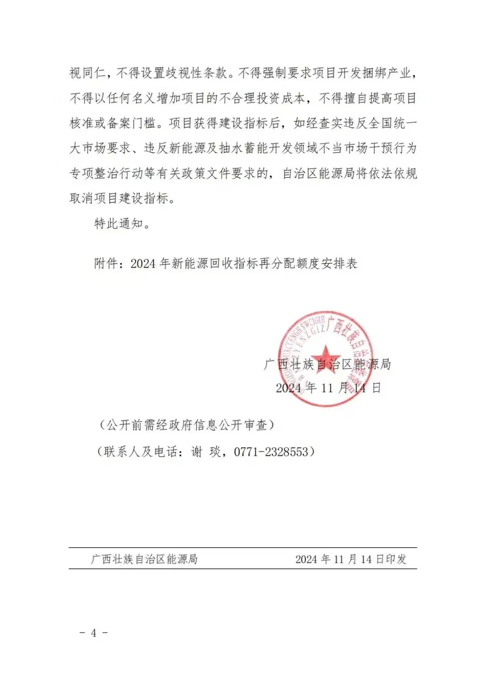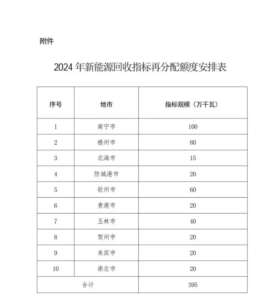 《通知》指出,为进一步加强新能源项目对电力系统绿色低碳转型支撑作用,推动2024年新能源回收指标更好发挥稳预期、稳增长作用根据有关政策要求,参照外省区做法并结合我区经济社会发展实际,经研究决定对2024年新能源回收指标进行再次分配。
