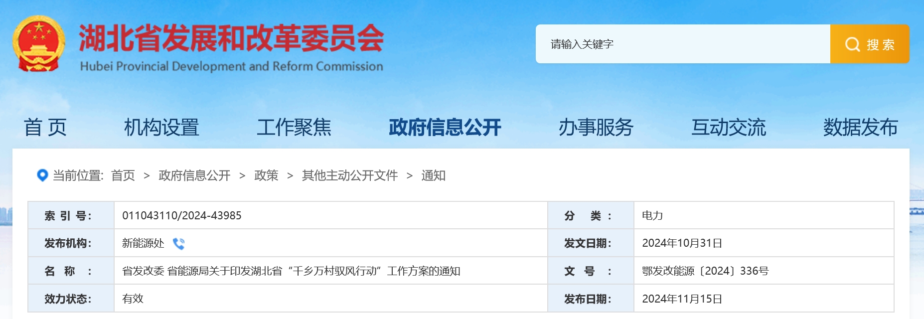 11月15日,湖北省发改委公布《省发改委 省能源局关于印发湖北省“千乡万村驭风行动”工作方案的通知》。