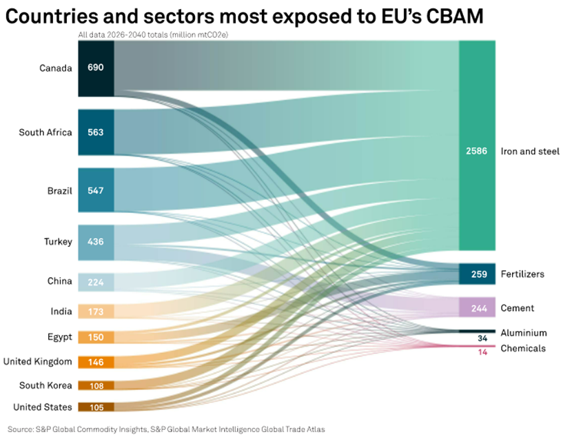 图说:受欧盟 CBAM 影响最大的国家和行业来源:S&P Global