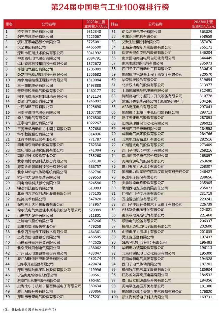 该榜单以2023年企业主营业务收入为基准,立足中国电气装备制造业,以第三方的角度根据国家相关统计部门的数据对电气企业整体情况进行梳理。是研究中国电气装备制造业与电力电网、工业和基础设施领域协调发展的重要参考。