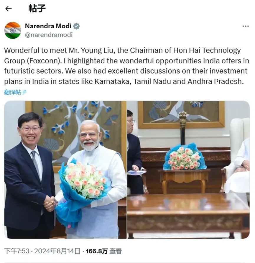 更早的时候,印度总理莫迪于8月14日在社交媒体上表示,很高兴与刘扬伟会面,双方就在印度的投资计划进行了讨论。此外,当时刘扬伟在还会见了印度的多位首席部长。