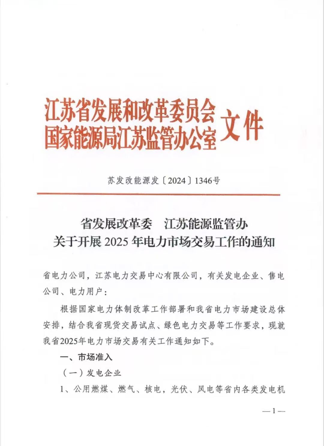 12月4日,江苏省发改委、江苏能监办下发《关于开展2025年电力市场交易工作的通知》。