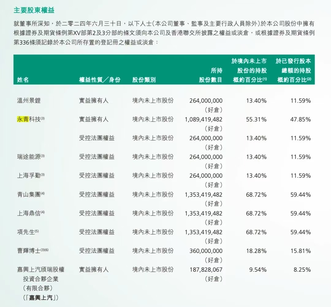 永青科技与项光达、浙江青山、上海鼎信、青山集团、瑞途能源及温州景锂一道,同为瑞浦兰钧控股股东。据2024年中报披露,永青科技持有瑞浦兰钧未上市股份、已发行股本分别为55.31%、47.85%。