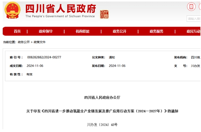11月6日,四川省政府办公厅印发《四川省进一步推动氢能全产业链发展及推广应用行动方案(2024—2027年)》。
