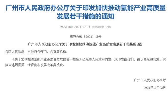 12月4日,身处我国氢能发展高地粤港澳大湾区的广州也发布了《关于印发加快推动氢能产业高质量发展若干措施的通知》。