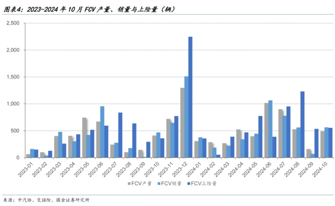 此外,氢能的应用场景则正以交通领域为支点加速突破。根据上险数据统计,2024年1-10月国内氢车累计上险量达 5705 辆,同比增长35.4%;其中10 月上险量为 560 辆,主要为商用车,同比增长 48.9%。由于统计口径差异,中汽协公布的 10 月 FCV 产销分别为 491/563 辆,同比增长 19.46/19.79%。