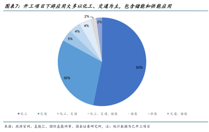 绿氢的应用场景正在不断延伸,据国金证券研究所统计,从当前开工项目看,化工和交通领域是当前应用的主流领域,分别有19和29个项目,同时,储能和供能的应用也正在同步推进示范项目。这一发展趋势也与国家发改委在《关于大力实施可再生能源替代行动的指导意见》提出的方向保持一致。