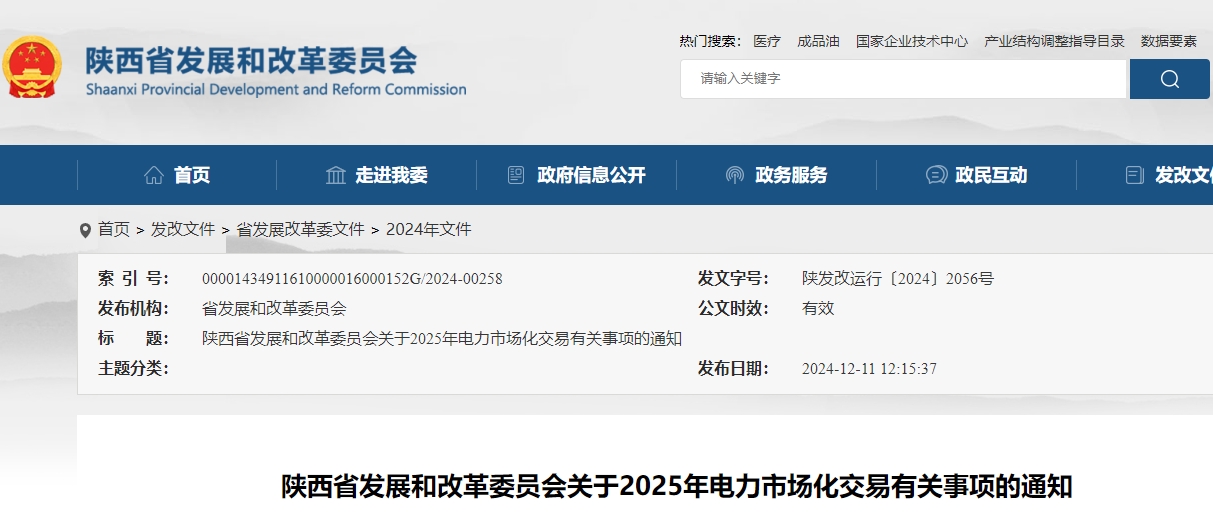 陕西省发展和改革委员会关于2025年电力市场化交易有关事项的通知