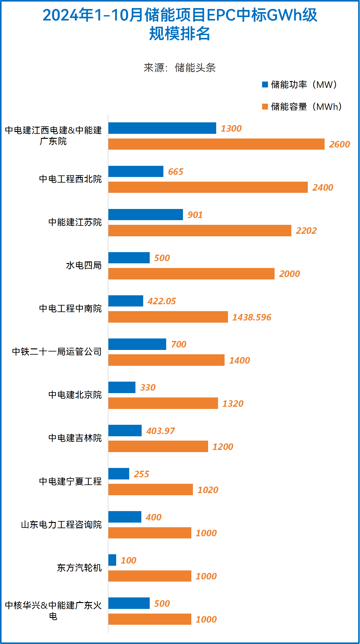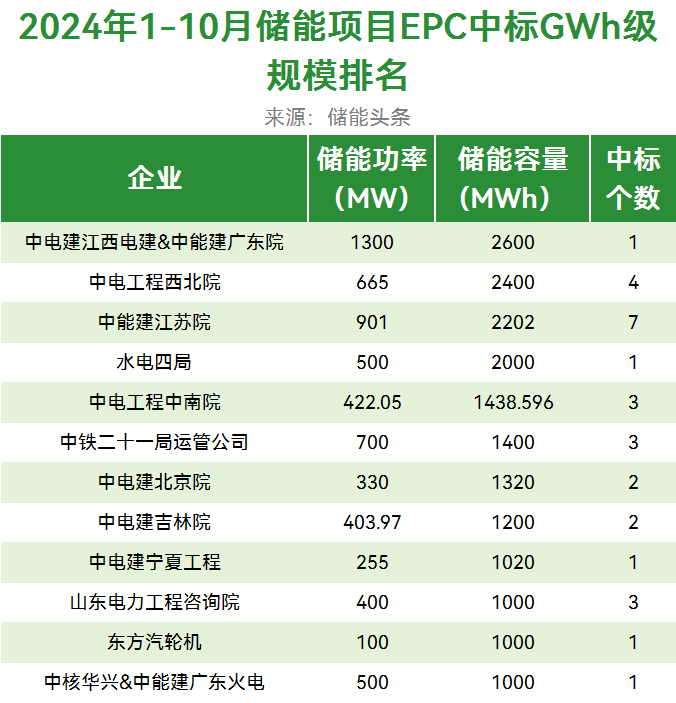 在储能项目EPC中标排行榜中,江西电建和中能建广东院联合体、西北电力设计院、中国能建江苏院位居前三。