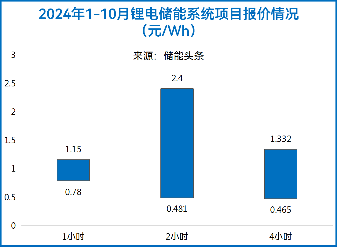 4小时储能系统报价区间为0.465-1.332元/Wh,平均报价为0.598元/W;
