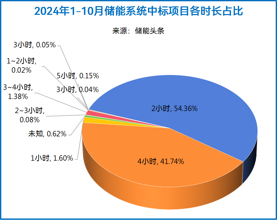 从储能时长来看,据储能头条(微信号:chuneng365)统计,2024年1-10月储能系统采购项目中,2小时储能系统共涉及89个项目/标段,占比约为54.36%,1h储能系统共涉及17个项目/标段,4小时储能系统共涉及56个项目/标段。