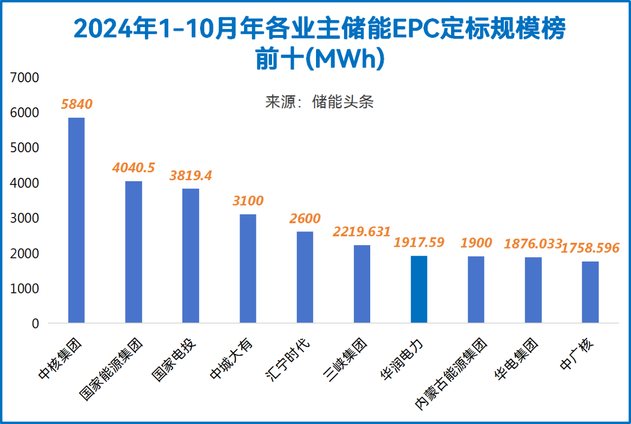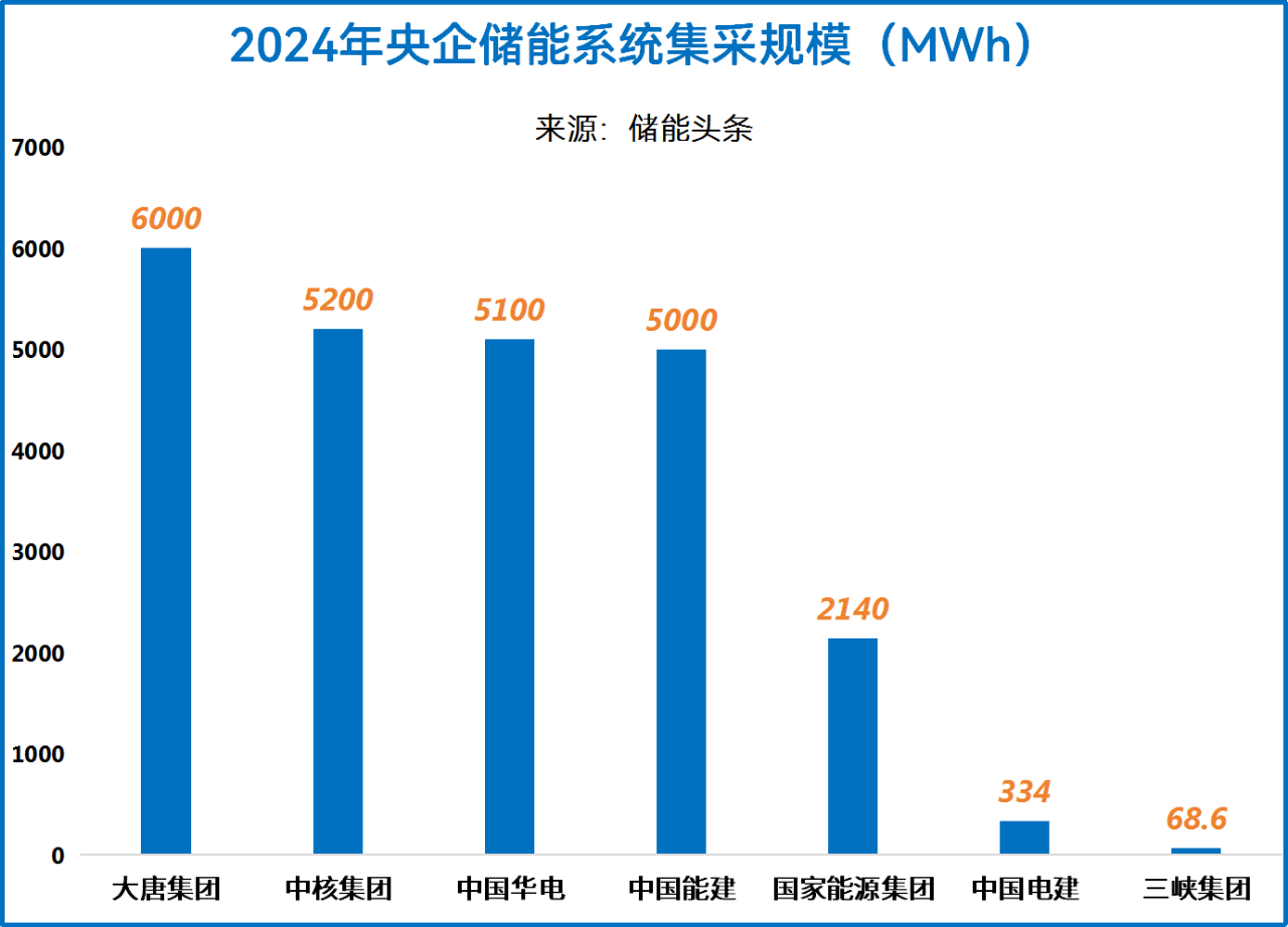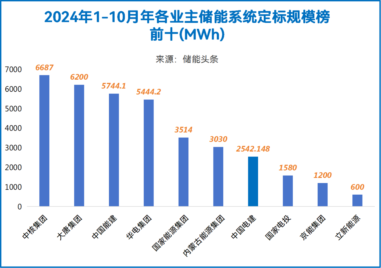 2024年1-10月完成大型储能系统集采的央国企开发商大唐集团、中核集团 中国华电、中国能建、国家能源集团、中国电建、三峡集团,规模为23.8GWh。