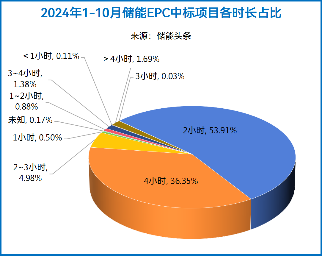 从储能时长来看,据储能头条统计,2024年1-10月储能EPC项目中,2小时储能仍然占据多数份额,占比约为53.91%,其次是4小时储能时长出现一定增长,占比达36.35%,1小时储能EPC项目虽然规模极小,数量较少,但是仍然有项目进行建设。