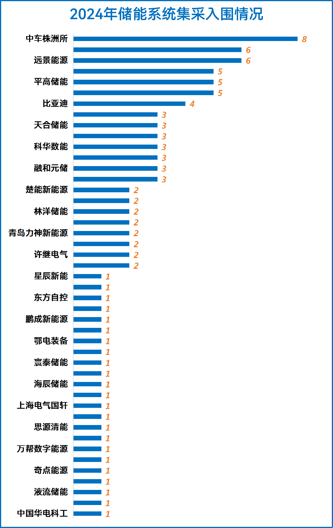 在2024年已开标的储能系统集采中,共有46家企业中标。其中,中车株洲所获最丰,中标数量达到8个,海博思创和远景能源紧随其后,中标数量达到6个。