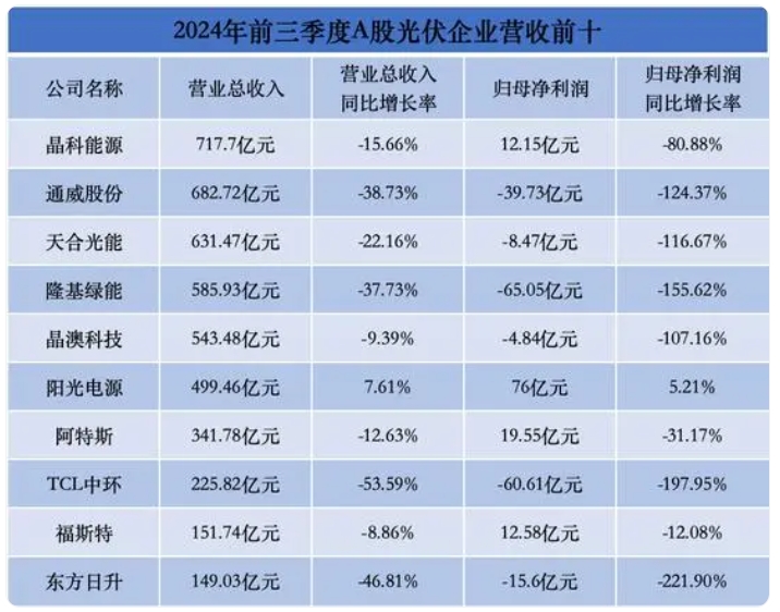 iFinD数据显示,2024年前三季度,在申银万国光伏设备行业分类的66家上市公司中,37家企业实现盈利,占比不到六成;54家企业归母净利润同比下滑,占比超过八成。