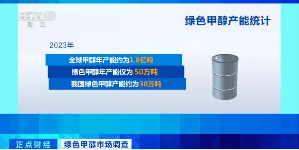 记者了解到,国内通过生物质来制取绿色甲醇是主要的技术路线之一,2023年,全球甲醇年产能约为1.8亿吨,其中绿色甲醇年产能仅为50万吨,我国绿色甲醇产能约为30万吨。