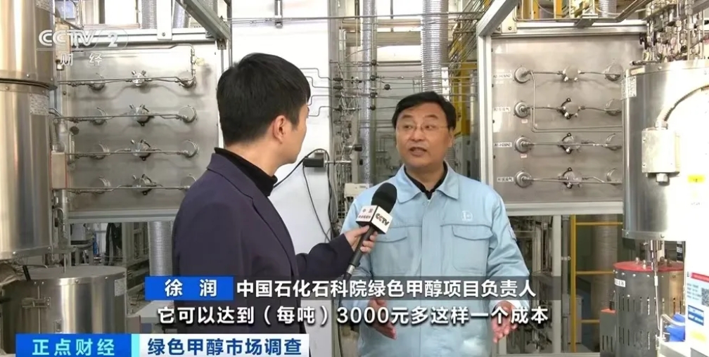 中国石化石科院绿色甲醇项目负责人 徐润:我们用生物质,包括秸秆类、沼气,它可以达到(每吨)3000多元的成本。但如果是煤化工的甲醇,大概在(每吨)2000多元的成本,用生物质来制取的甲醇,会很快地实现量产来替代部分煤制甲醇。
