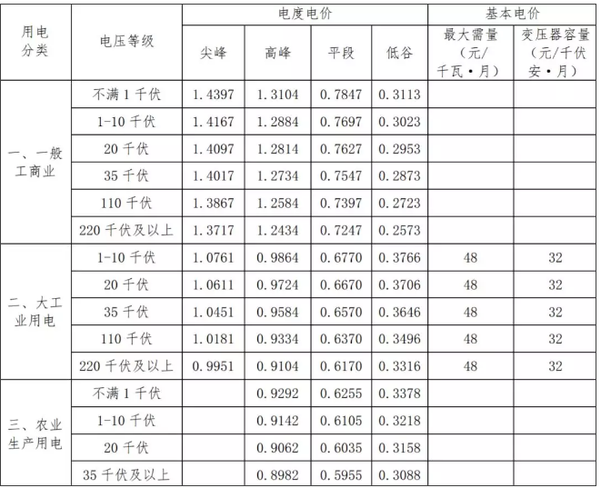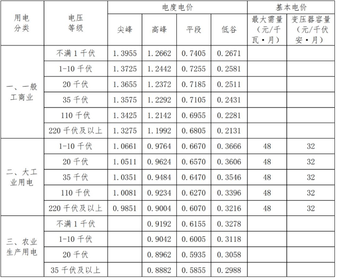 3. 峰谷电价时段划分为:高峰时段(10:00-15:00;18:00-21:00), 平段(7:00-10:00;15:00-18:00;21:00-23:00),低谷时段(23:00-7:00);夏季尖峰时段(7-8月11:00-13:00和16:00-17:00)。