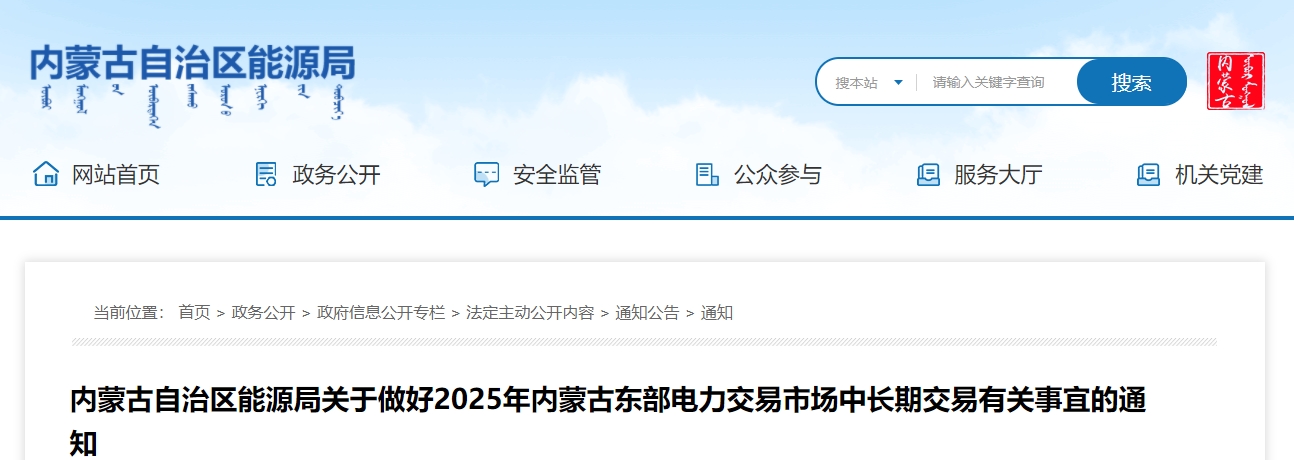 日前,内蒙古能源局发布了《内蒙古自治区能源局关于做好2025年内蒙古东部电力交易市场中长期交易有关事宜的通知》、《内蒙古自治区能源局关于做好2025年内蒙古电力多边交易市场中长期交易有关事宜的通知》。